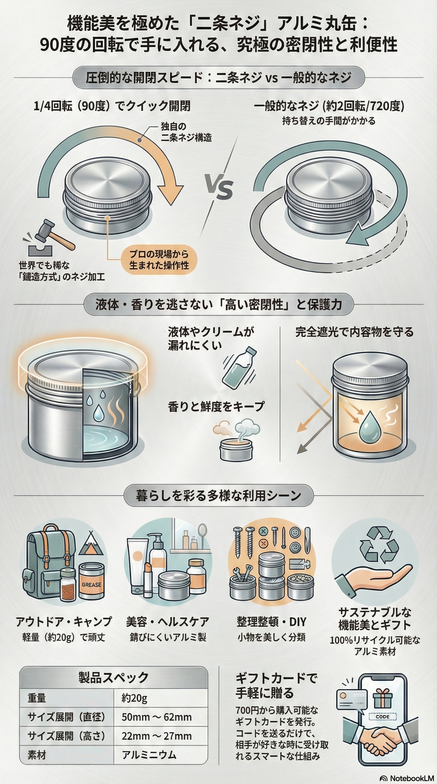 独自開発技術の二条ネジ構造により、クリーム類や液体類が漏れにくい。パッキンシート付では缶をひっくり返したり振ったりしても漏れない。香りも抜けにくい。